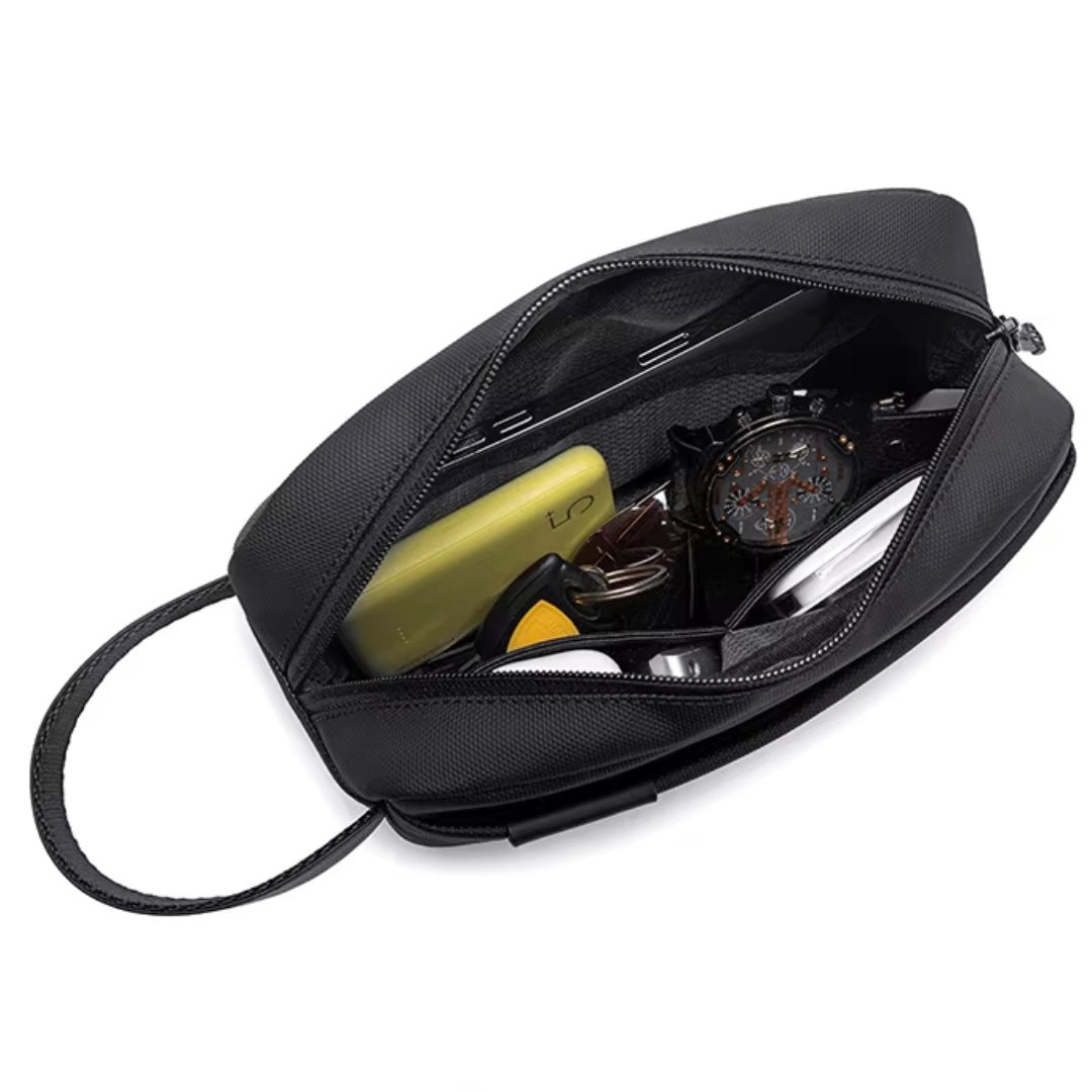 مصنوعة من نايلون مقاوم للماء بلمسة ناعمة وتصميم بسيط يوحي بالفخامة، مثالية للرحلات القصيرة أو الاستخدام اليومي لتخزين الأغراض الأساسية مثل الهاتف، المفاتيح، الساعة، والمحفظة.